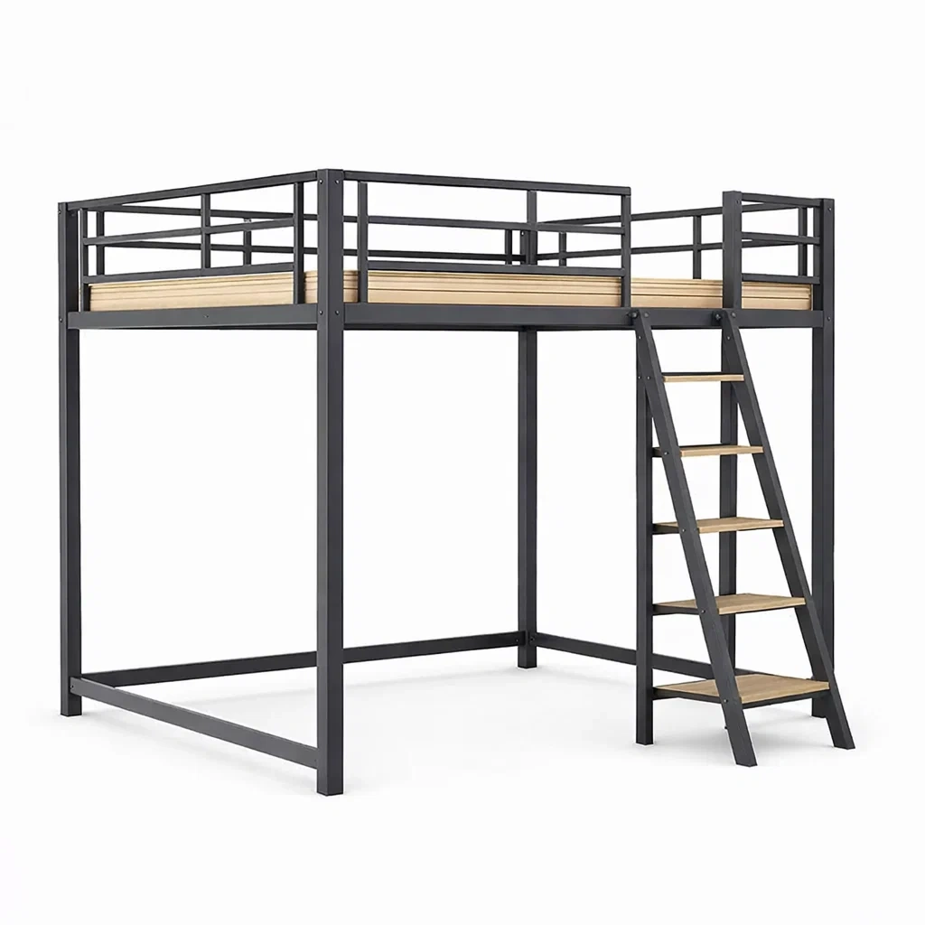 Letto a soppalco in metallo nero e legno con scala