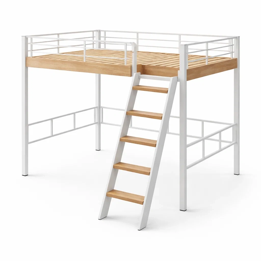 Letto a soppalco in metallo bianco e legno con scala integrata