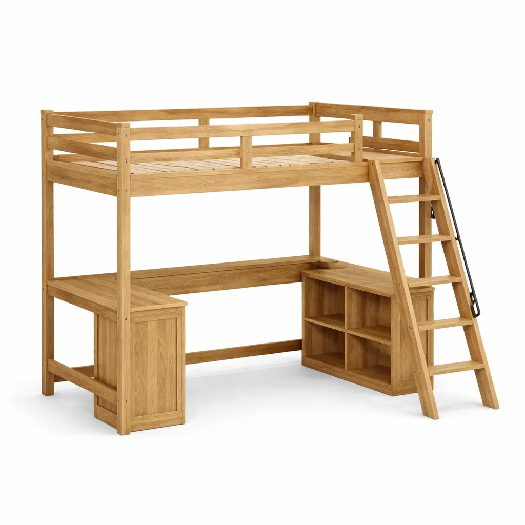 Letto a soppalco con scrivania e libreria in legno di rovere