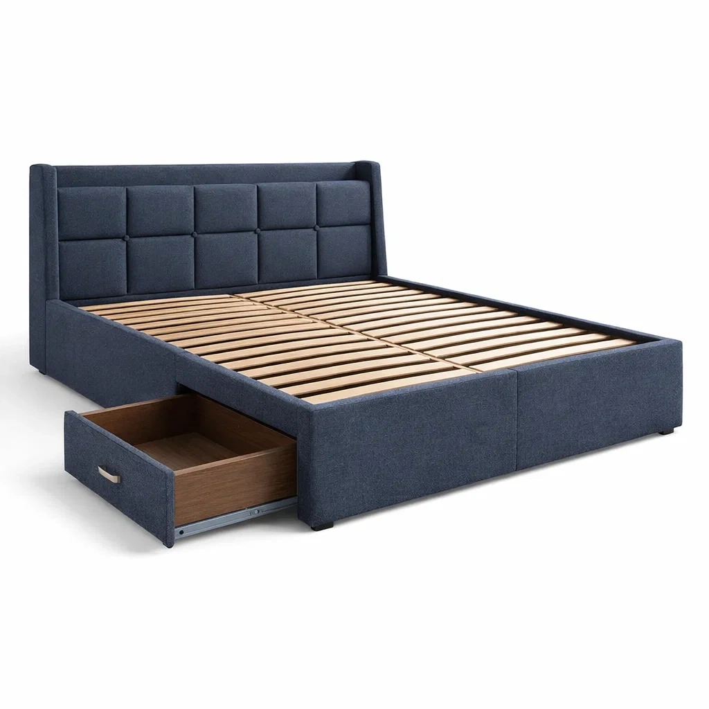 Letto contenitore matrimoniale in tessuto e legno blu con cassetti