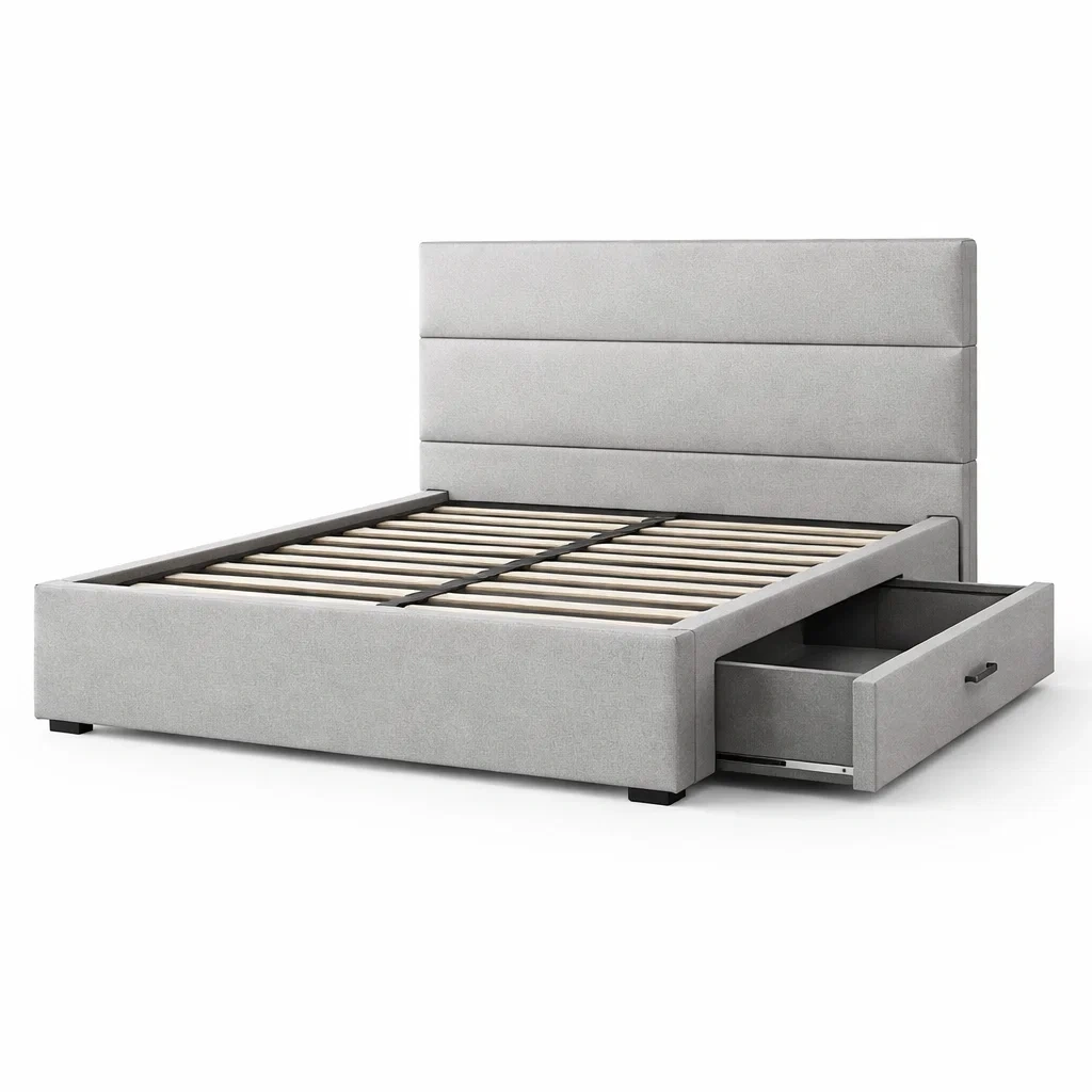 Letto contenitore matrimoniale in legno con testiera in tessuto grigio e cassetti