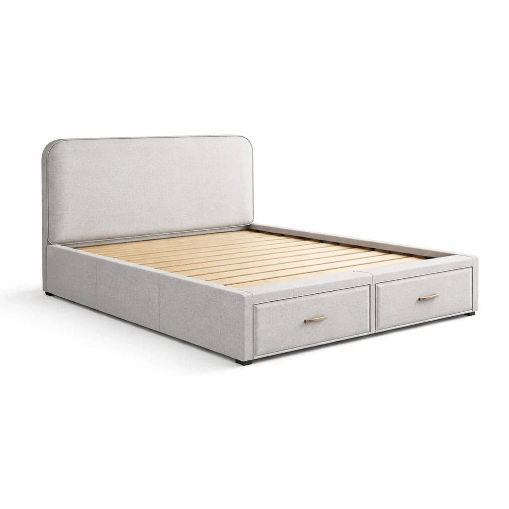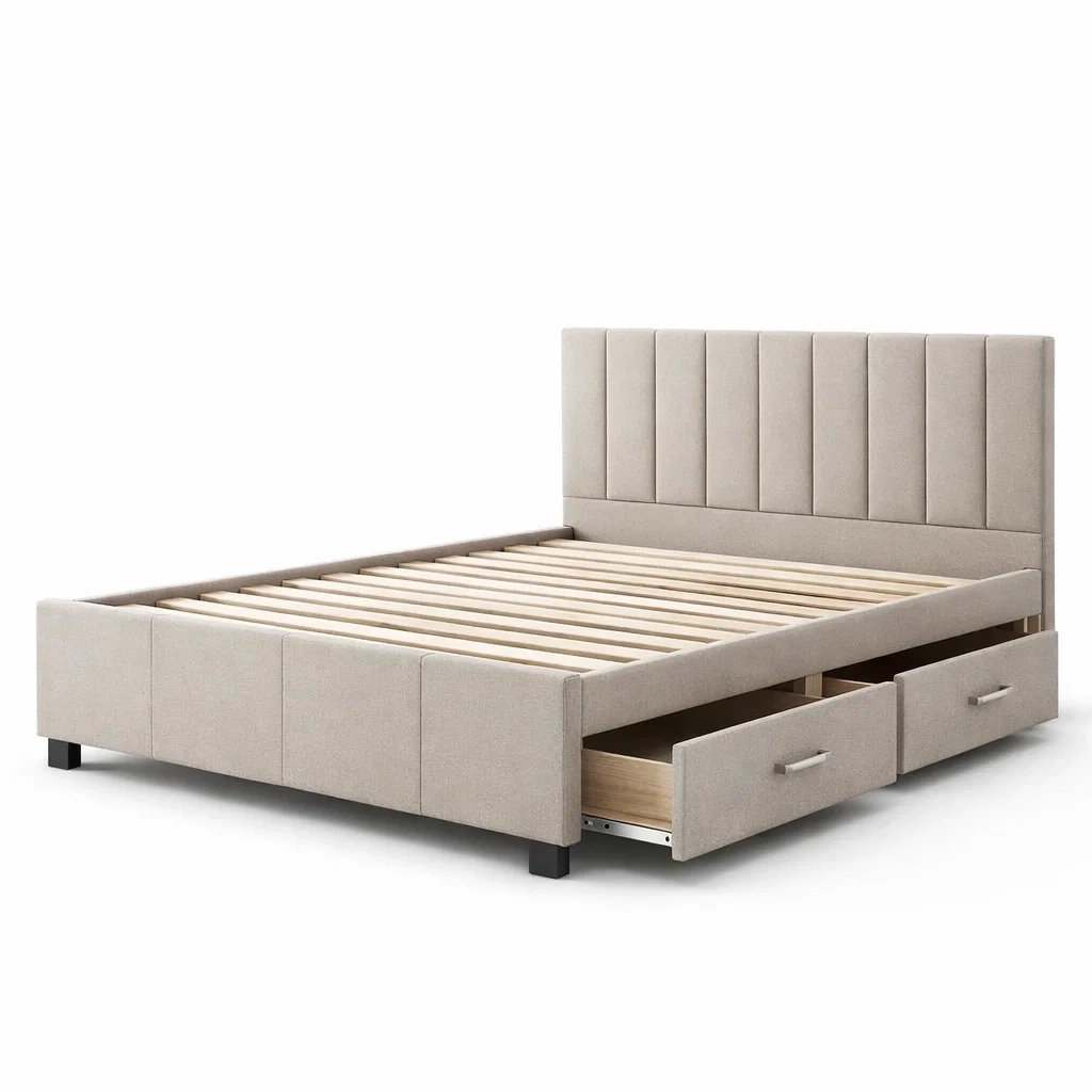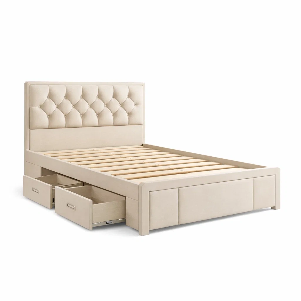 Letto contenitore in legno con rivestimento in tessuto beige e cassetti