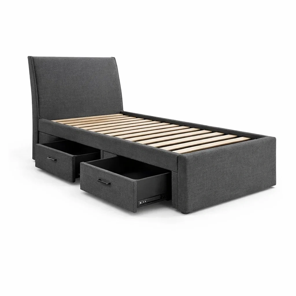 Letto contenitore singolo in tessuto grigio con cassetti