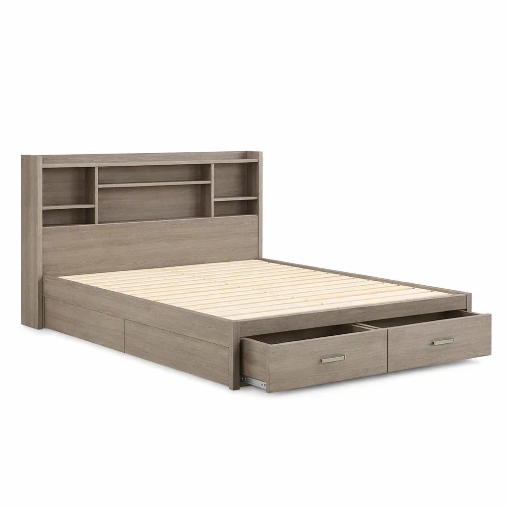Letto contenitore in legno grigio con cassetti e libreria