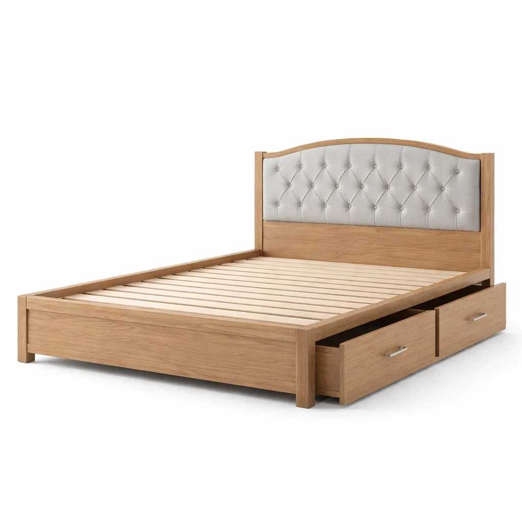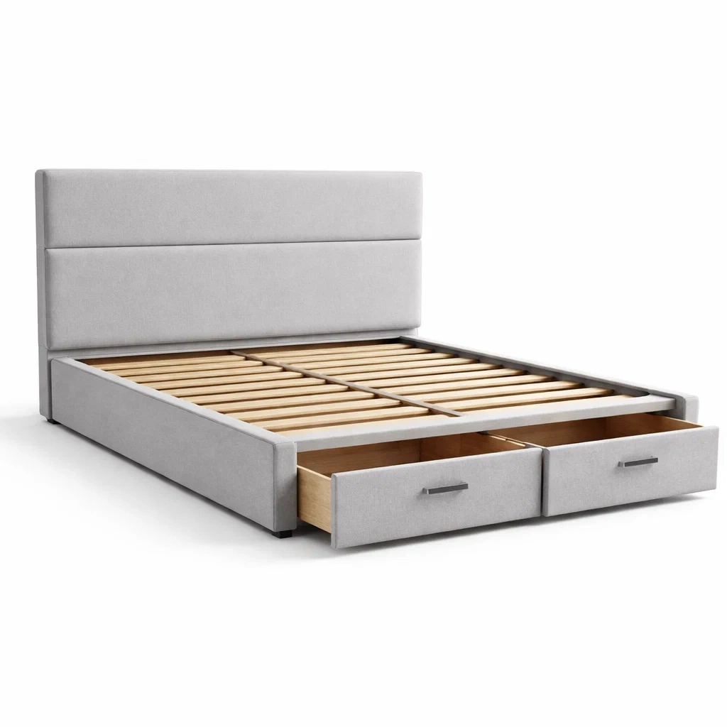 Letto contenitore matrimoniale in legno e tessuto beige con cassetti