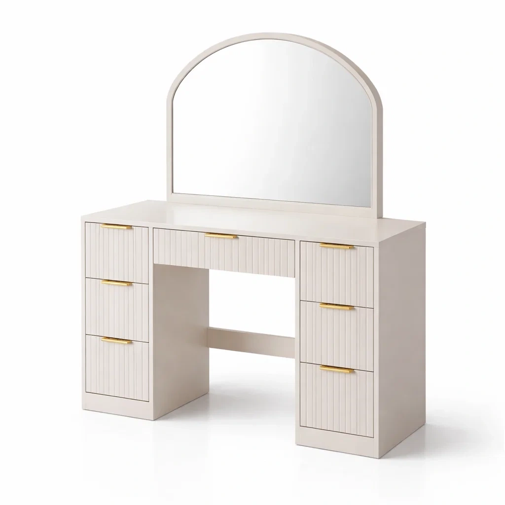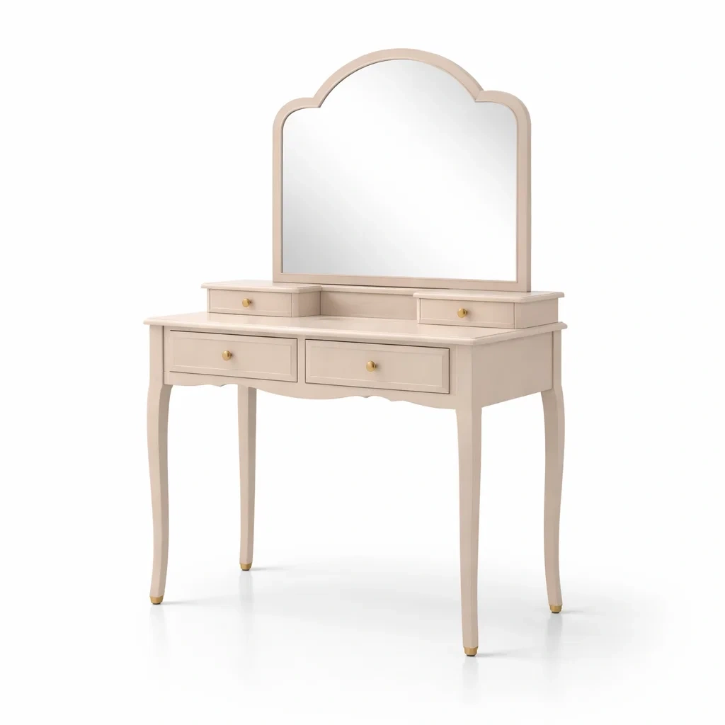 Toeletta beige in legno con specchio e 4 cassetti