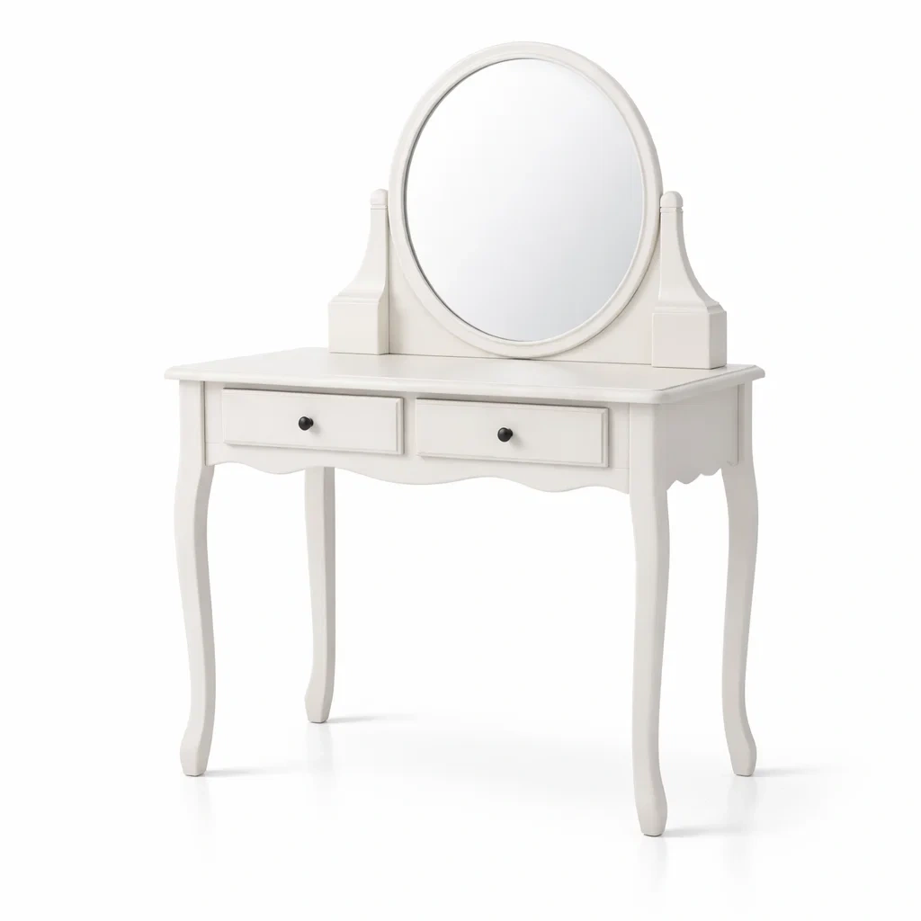 Toeletta in legno bianco con specchio rotondo