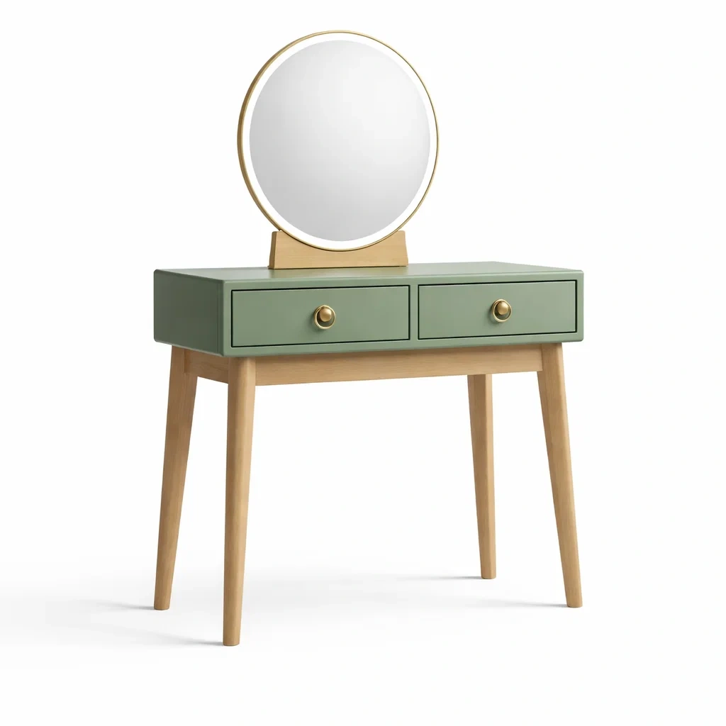 Toeletta in MDF e legno massello verde con specchio rotondo