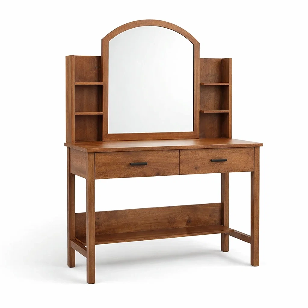 Toeletta in legno massello marrone con specchio e ripiani