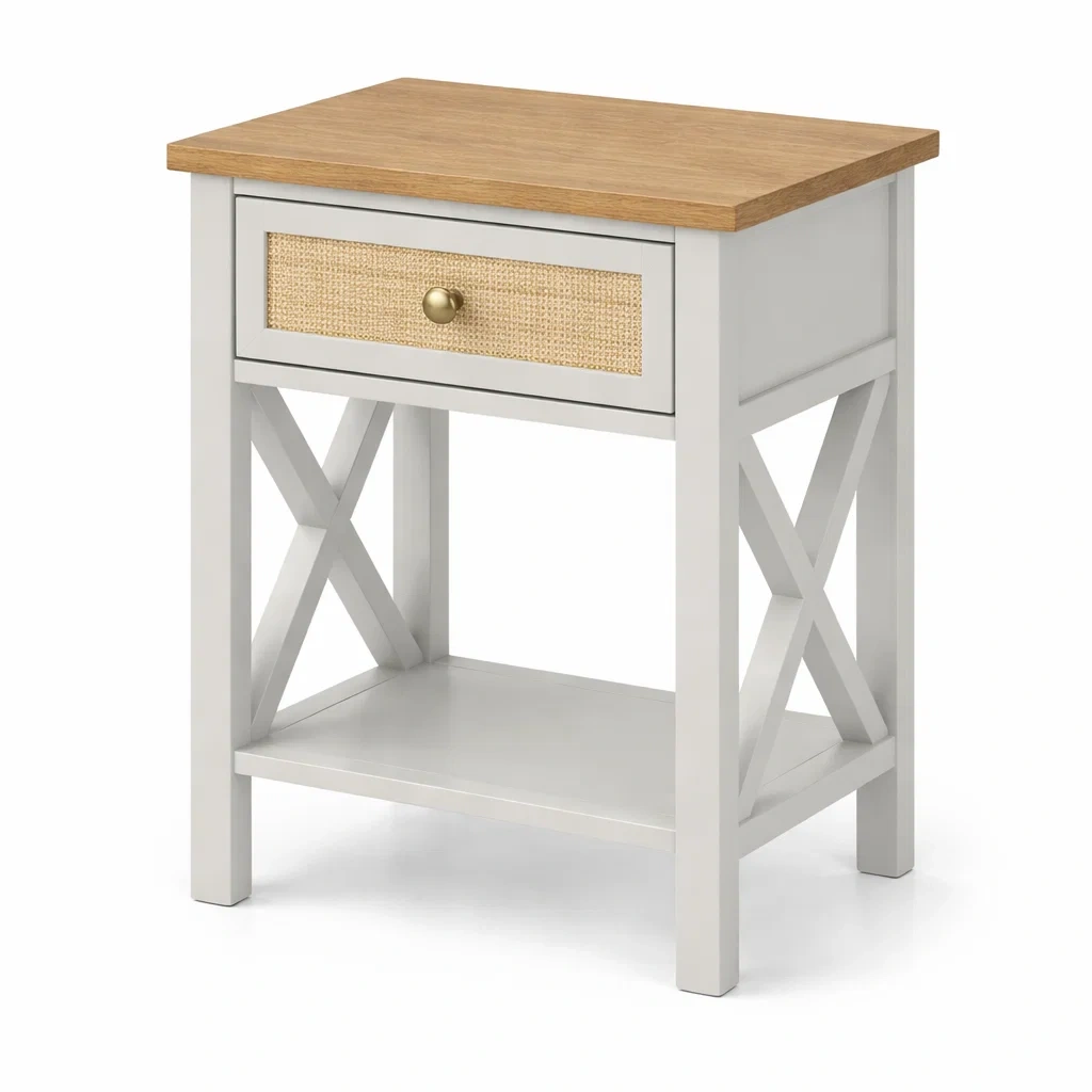 Questo comodino è realizzato con un piano in legno massello di rovere e un telaio in MDF, finito con una superficie laccata. Dispone di un cassetto in paglia intrecciata per stoccaggio. La struttura è solida e di colore bianco con dettagli in rovere. Le dimensioni del comodino sono 40 cm di lunghezza, 30 cm di larghezza e 60 cm di altezza. Il peso totale è di 5 kg.