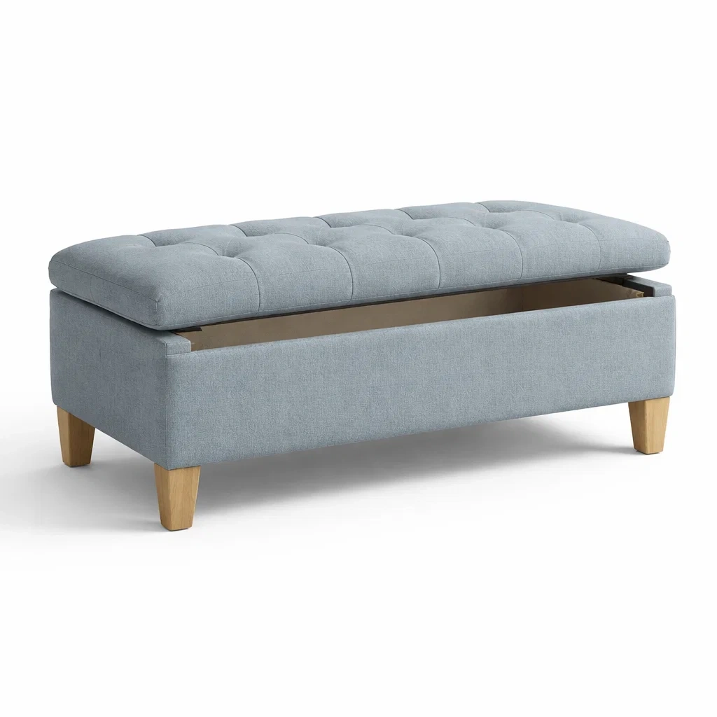 La panca contenitore presenta un rivestimento in tessuto di lino color Azzurro e un'imbottitura interna in schiuma. La base è realizzata in legno massiccio. Misura 120 cm di lunghezza, 40 cm di larghezza e 45 cm di altezza. Include un cuscino trapuntato e offre una capacità di carico massima di 100 kg. Spazio interno utile per contenere oggetti personali.
